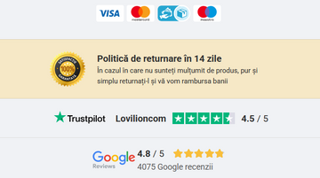 Livrarea este asigurată de Poșta Română sau de un curier local. Veți fi informați prin SMS și telefonic înainte de livrare. Plata se poate efectua în numerar sau cu cardul; dacă ați plătit deja produsul, nu este necesar să plătiți din nou. În căsuța poștală veți găsi o notificare despre colet. Dacă produsul nu vă îndeplinește așteptările, îl puteți returna fără a specifica motivul în termen de 14 zile de la livrare. Produsul returnat trebuie să fie nedeteriorat și în ambalajul original. Atașați formularul completat pentru reclamații/returnare și vă vom returna banii sau vom schimba produsul cu unul de valoare echivalentă, fără costuri suplimentare. În acest fel, asigurăm satisfacția clienților noștri fideli.
