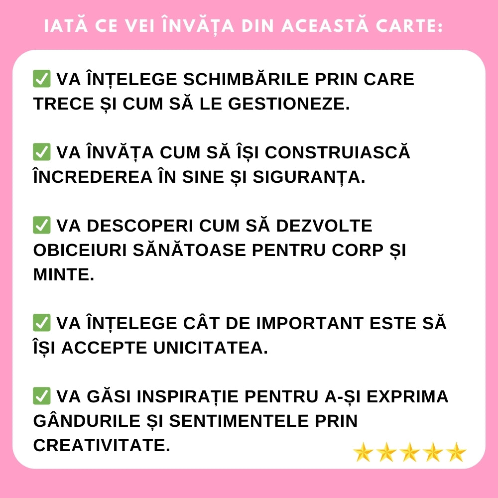 Această carte este creată pentru a ajuta fetele să înțeleagă, prin povești captivante și sfaturi practice, schimbările prin care trec în timpul adolescenței. Cu un ton cald și încurajator, le ghidează pas cu pas prin provocările acestei perioade fascinante.