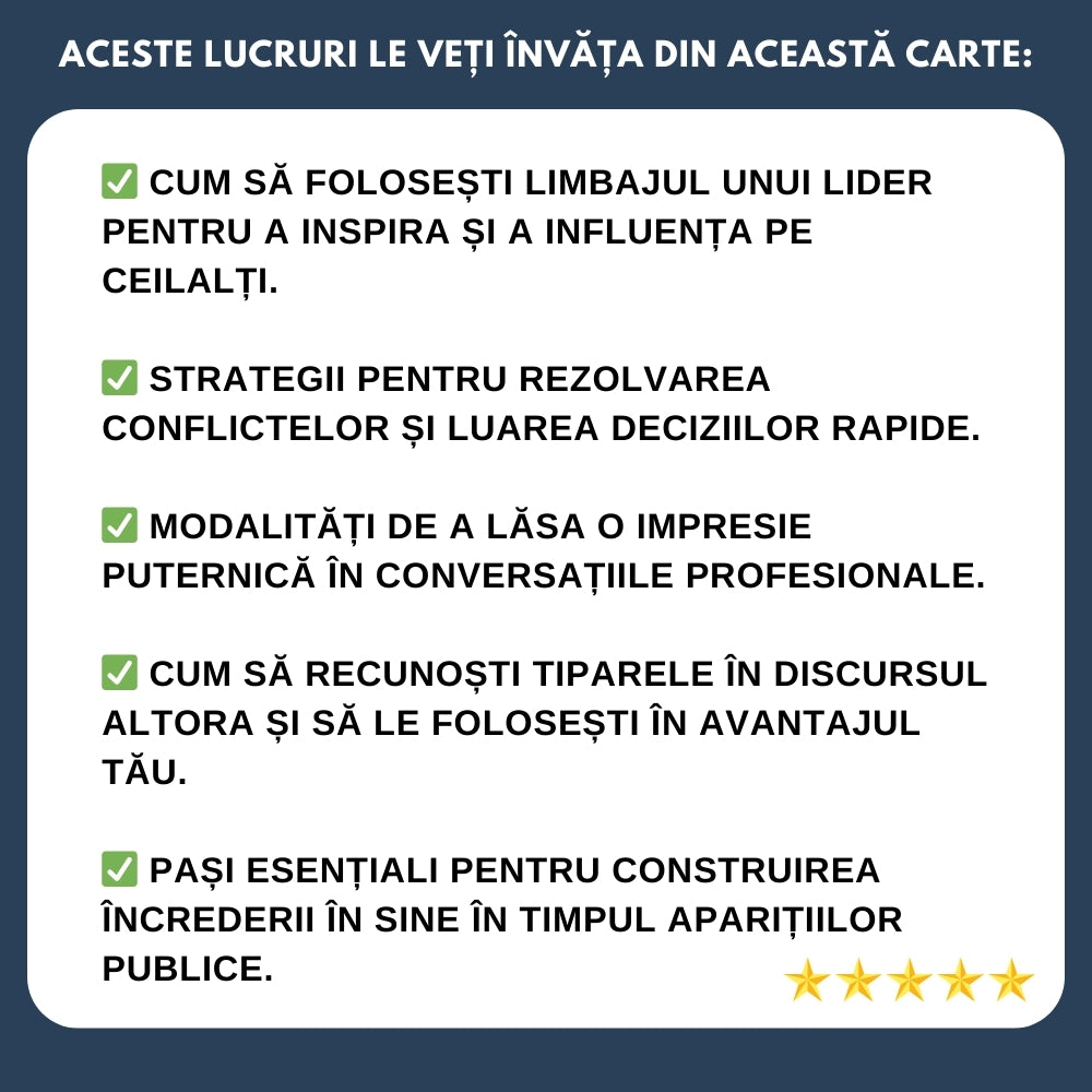 Învață să vorbești cu încredere, claritate și autoritate – la fel ca liderii de top. Această carte îți oferă instrumente practice și abilități pentru comunicarea de zi cu zi, negocieri de afaceri și prezentări impresionante. Indiferent de nivelul tău actual, acest ghid te va ajuta să îți ridici exprimarea la nivelul următor.